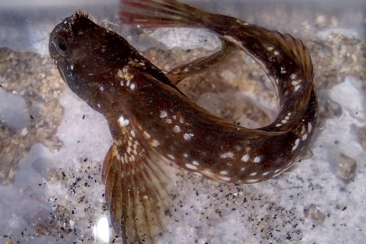 Of all the treasures we uncovered, two stood out as exceptional. The first, stretched inside a deep crevice and spotted by Oli, was a spiny starfish, grey-blue in colour and studded with pale spiked plates. As Britain’s largest starfish, this species has been recorded up to 70cm in length and this was only a fraction smaller. The second, I discovered on parting some of the shoreline skirts of seaweed. Movement on the exposed sand revealed a small fish and, on closer inspection, one that was covered in pale blue spots. At last! My first Montagu’s Blenny and one of several species named after nineteenth century Kingsbridge naturalist, George Montagu.
