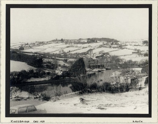 View of Kingsbridge after snowfall 12.1979 from eastern side towards West Alvington over creek (Kingsbridge Cookworthy Museum)