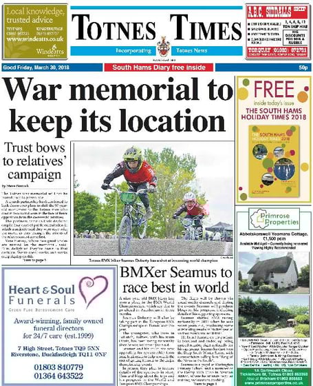 We lead on news that plans to move the war memorial outside St Mary’s Church, Totnes, have been shelved. Our picture story is about a nine-year-old boy who has dreams of becoming the world’s best BMX rider.